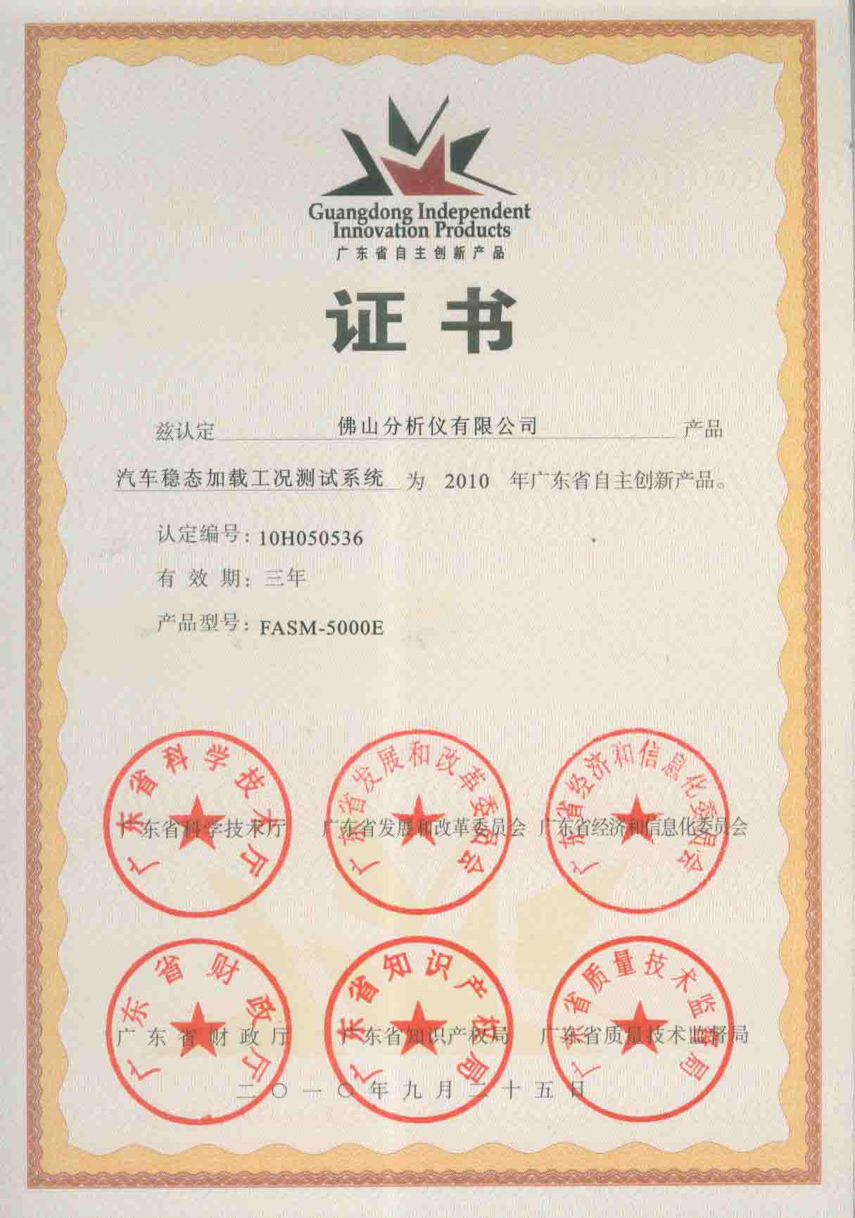 我公司"汽車穩(wěn)態(tài)加載工況測(cè)試系統(tǒng)"被認(rèn)定為2010年廣東省自主創(chuàng)新產(chǎn)品。